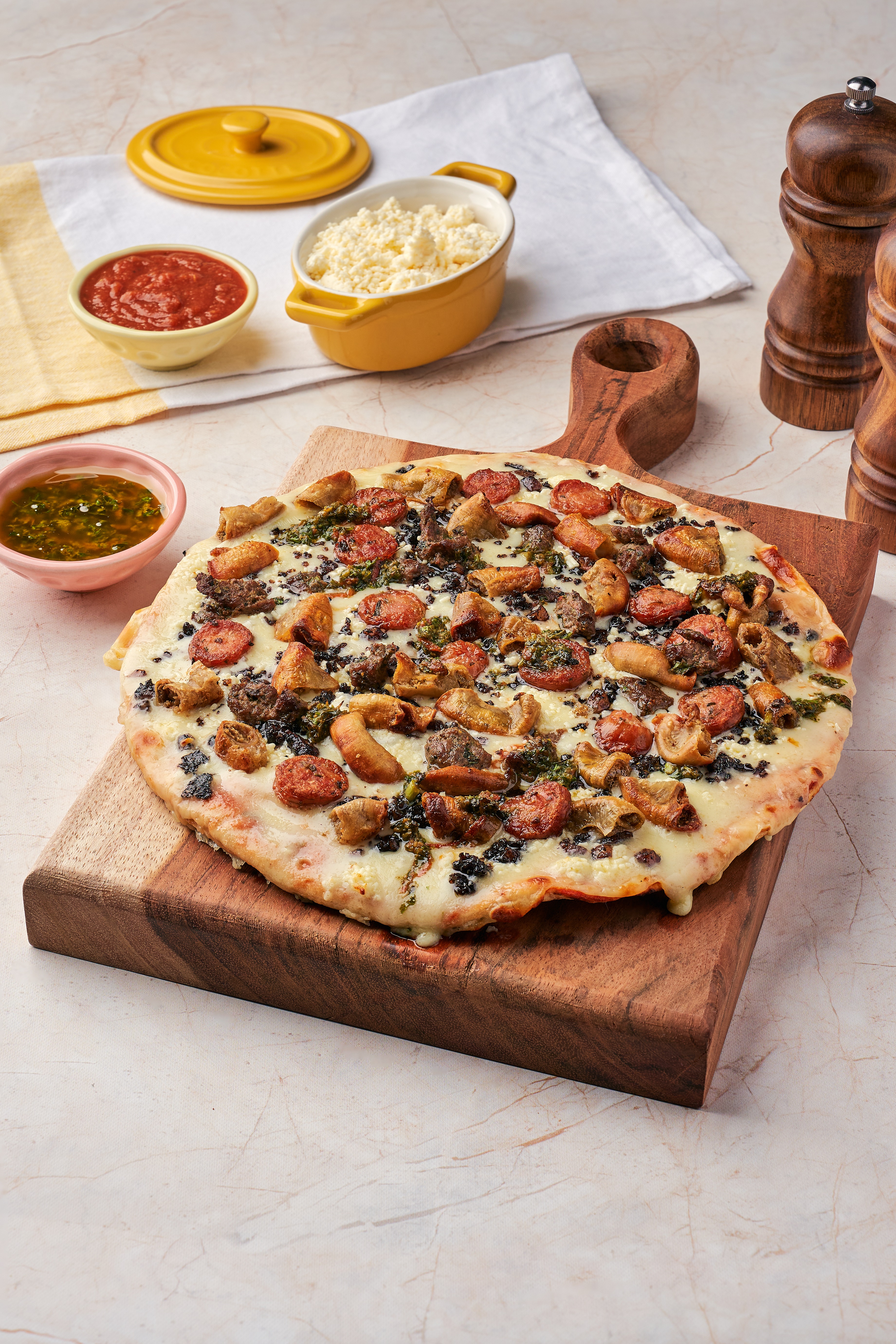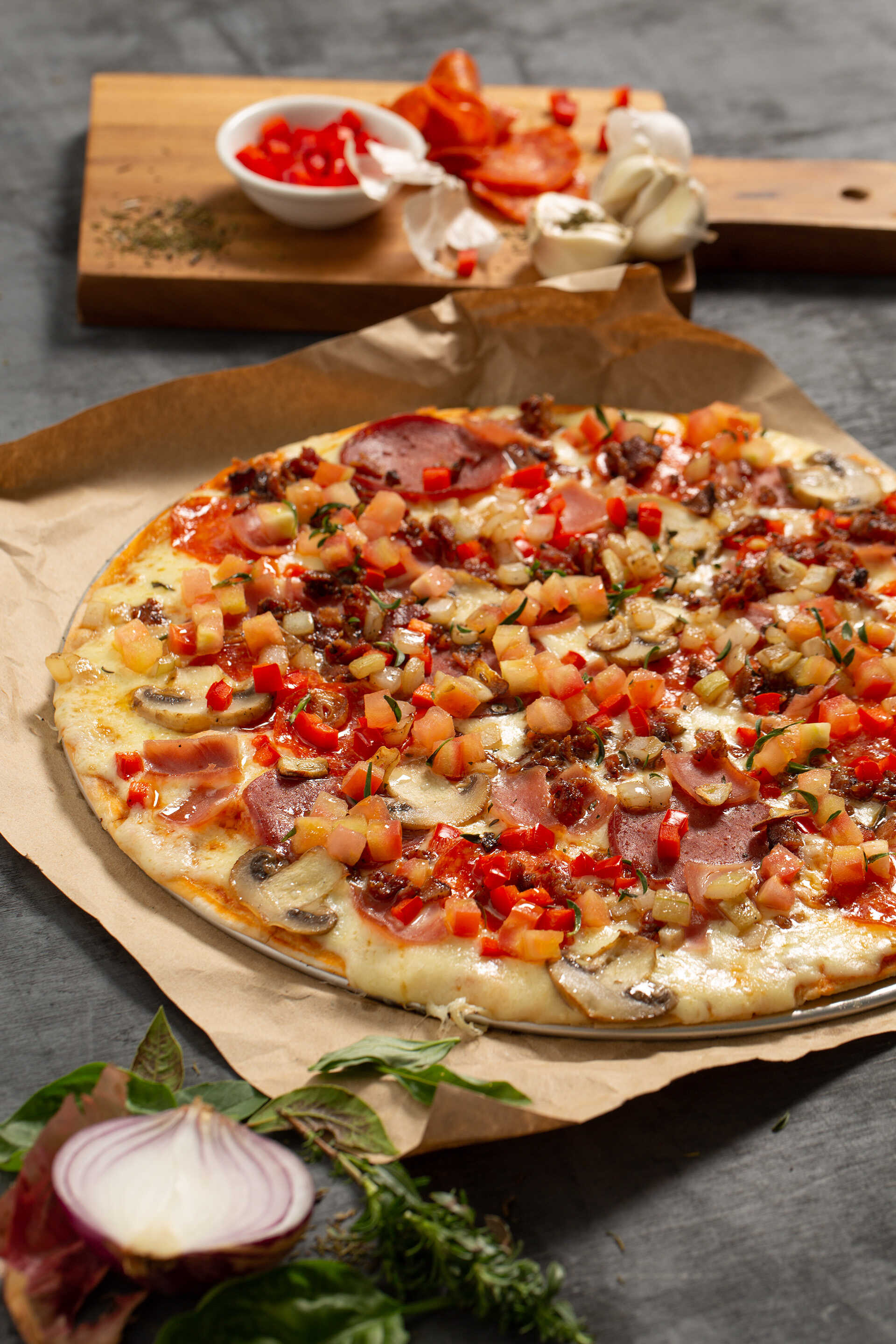 Queso, jamón, pepperoni, tocineta crocante, champiñones, cebolla, pimentón y tomate.