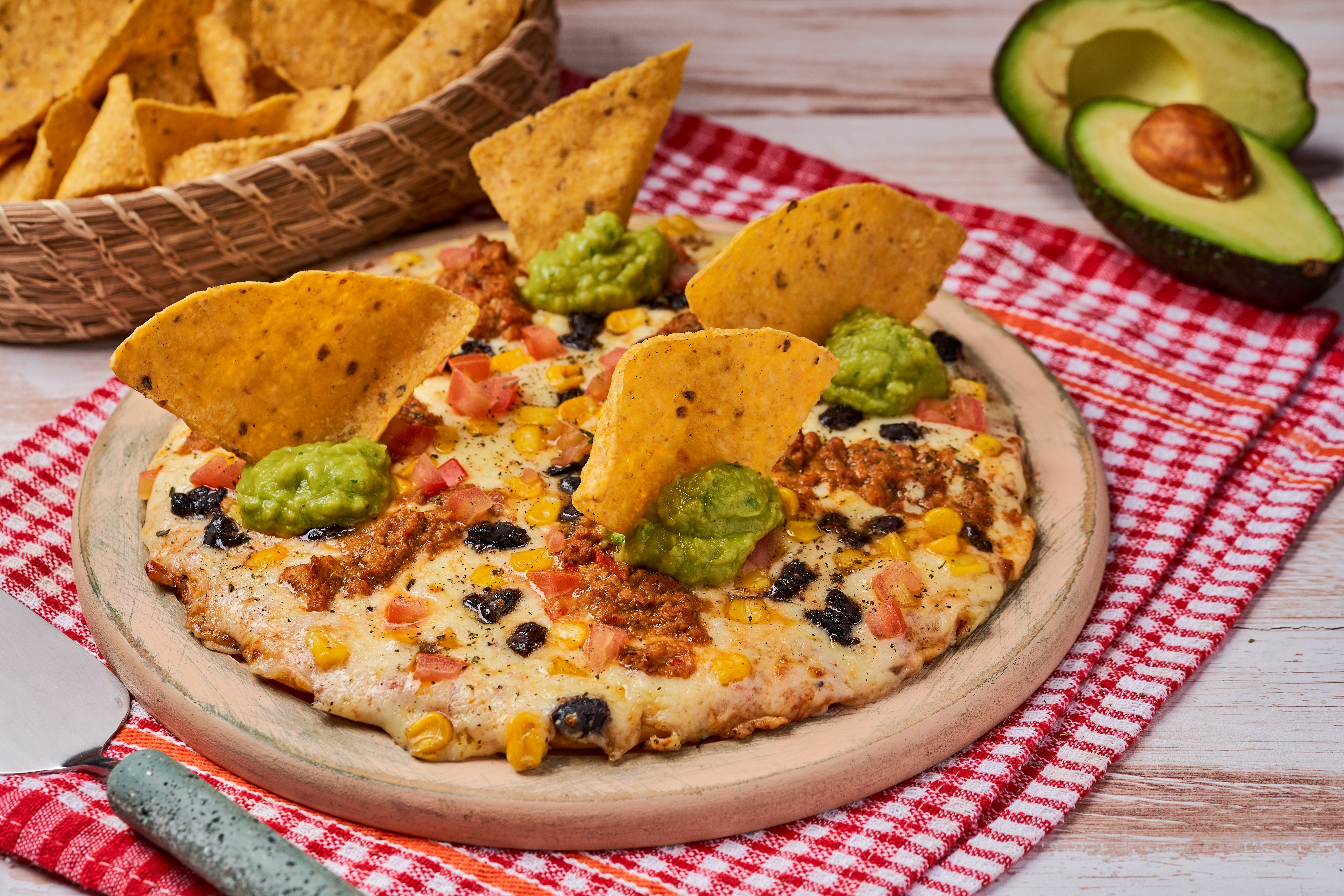 Queso, carne molida, frijol refrito, maicitos dulces, tomate, guacamole cremoso y nachos.