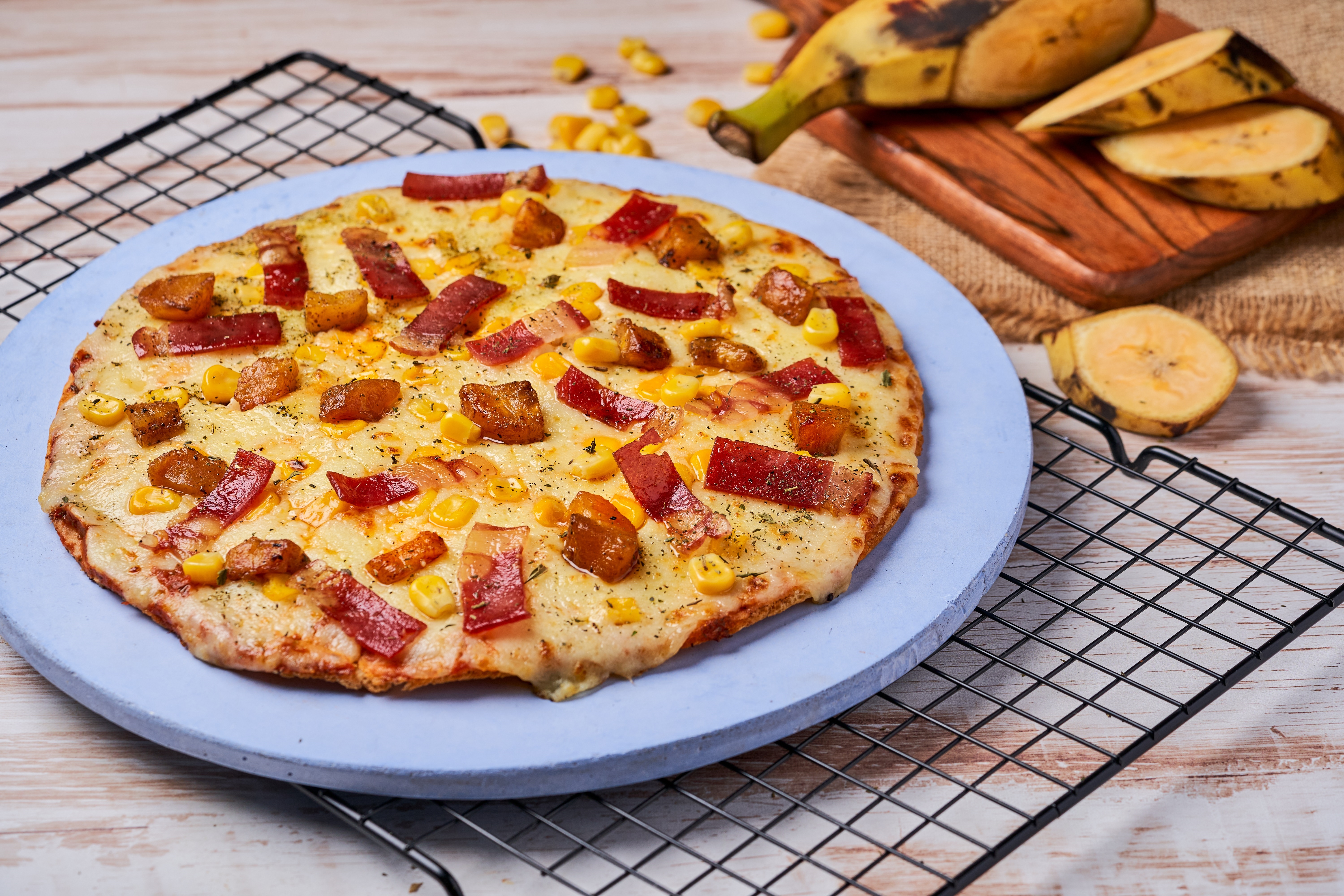 Queso, tocineta, madurito, maicitos dulces.