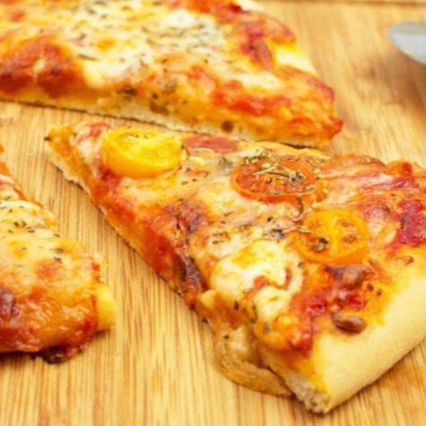 Pizza master de 4 porciones, masa madre, salsa tomate de la casa, maiz, tocineta y queso mozarella