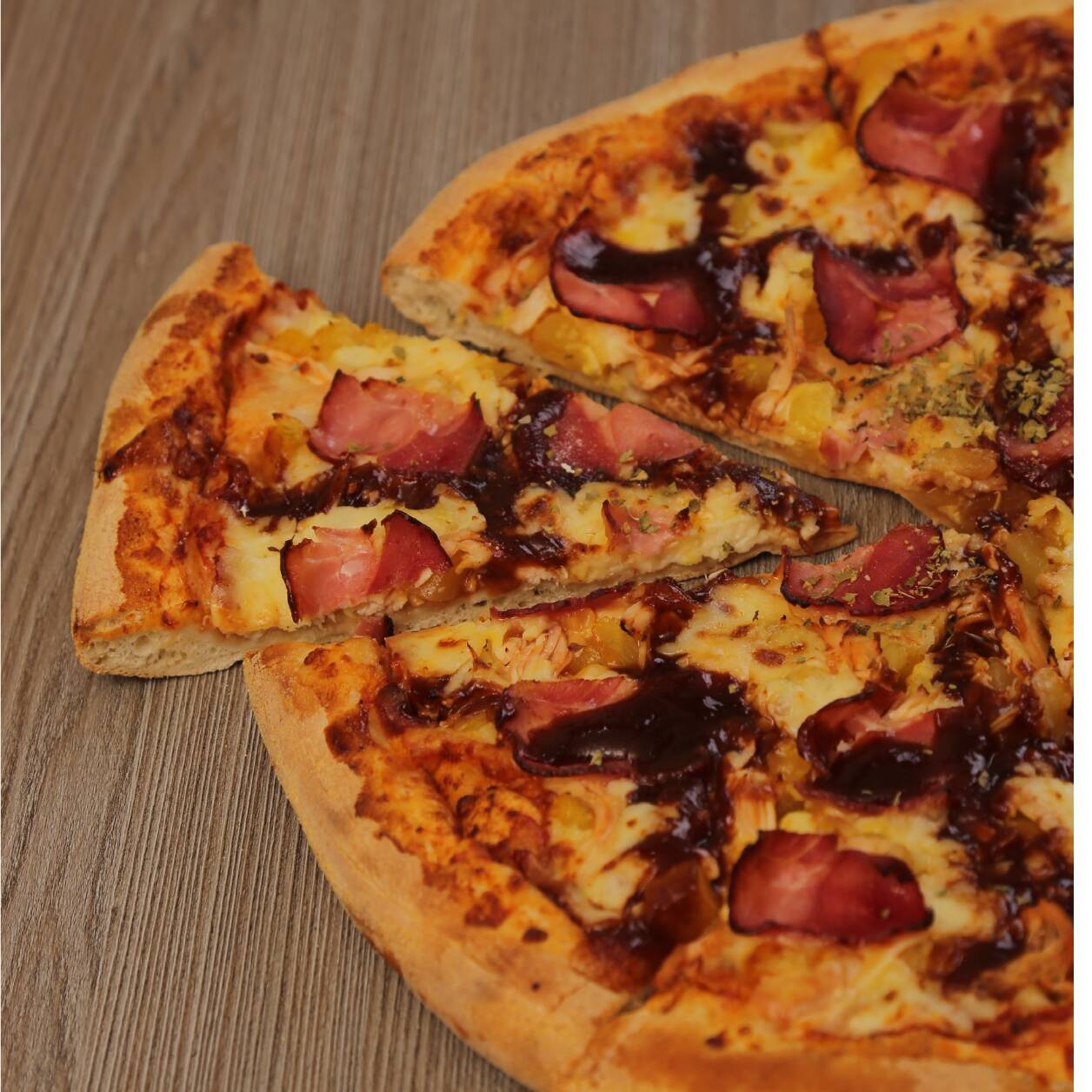 Pizza BBQ de 4 porciones, masa madre, salsa tomate de la casa, queso mozarella, piña, pollo, tocineta y salsa bbq.