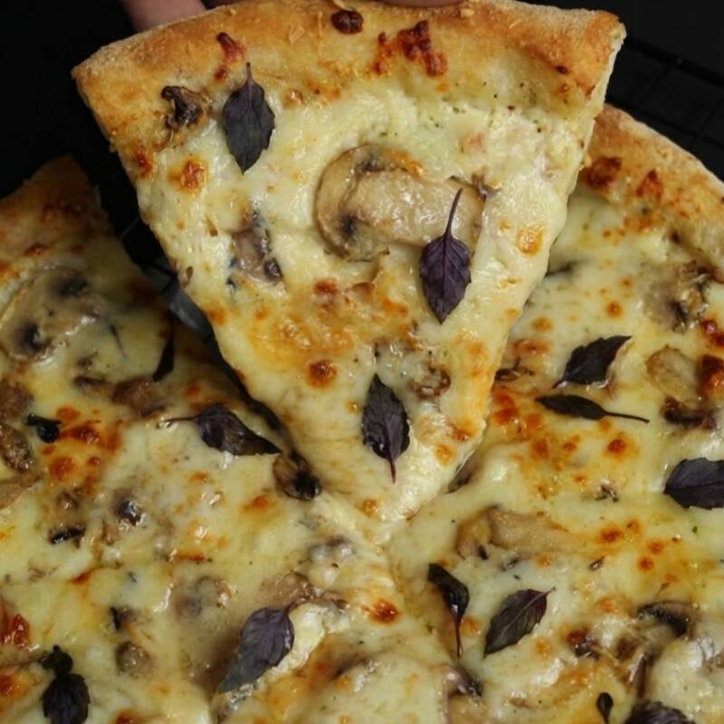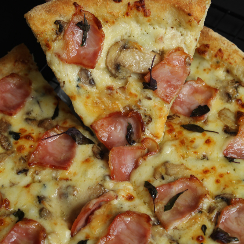 Pizza de 4 porciones, Base de crema de leche aromatizada en ajo y reduccion de tocineta, Champiñones, Tocineta, Queso Mozzarella y Parmesano,