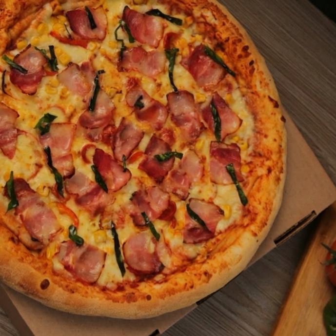 Pizza de 4 porciones. Ingredientes: tocineta, maíz, pollo, pimentón y champiñones.
