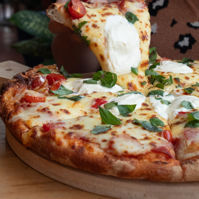 Pizza margarita de 8 porciones, masa madre, salsa tomate de la casa, oregano, tomate, queso parmesano y queso mozarella