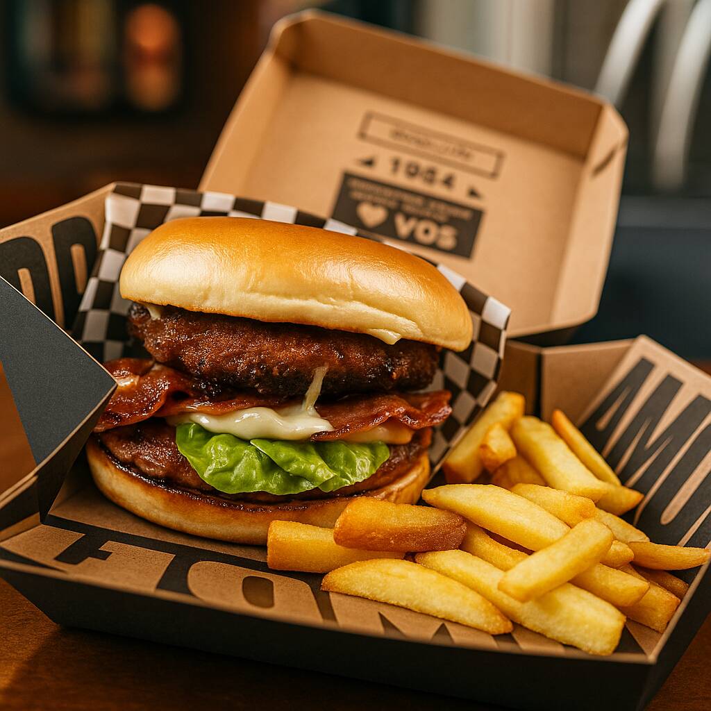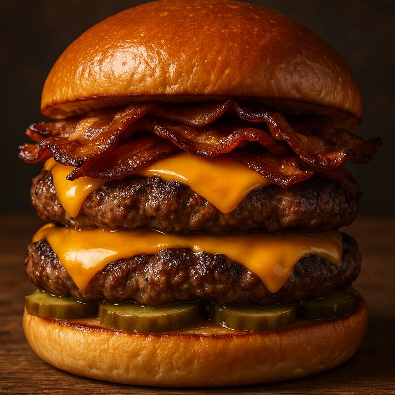 Doble (2) Carne artesanal 130 gramos, doble queso Cheddar y tocineta + papas a la Francesa