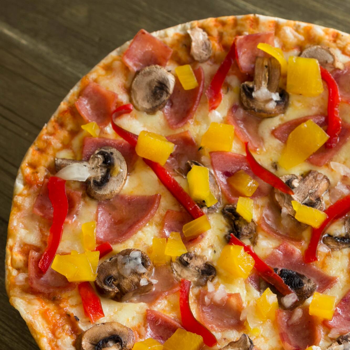 Jamón, salami, cebolla, piña, pimentón y champiñon.