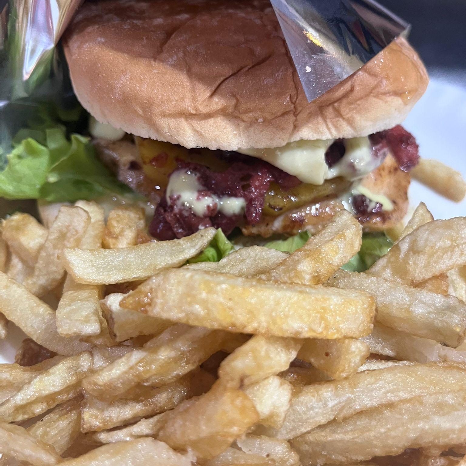 Pan artesanal arabe, lechuga, tomate, cebolla y pepinillos caramelizados, queso mozzarela, tocineta, piña asada, acompañado de papa francesa.