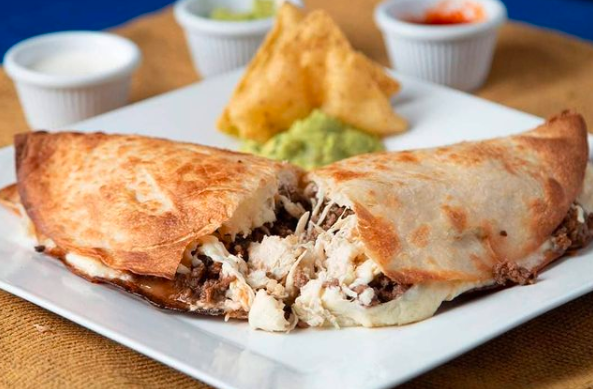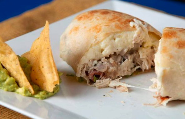 Pollo, frijol refrito, queso, lechuga, pico de gallo y salsas de la casa