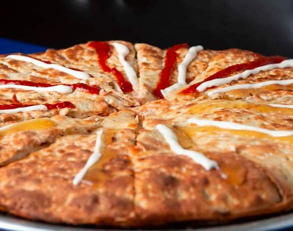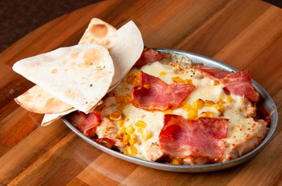 Tres tortillas blandas, julianas de pollo a la parrilla, tocineta, maíz tierno, queso, pimentón verde y rojo, cebolla