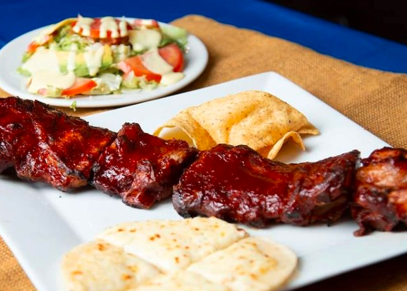 Costillas por 460 gr en salsa BBQ, ensalada de la casa y nachos.