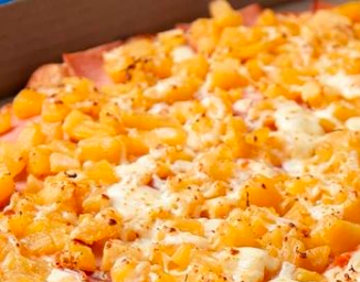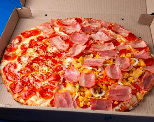 Queso, jamon, salami, pepperoni, tocineta, maíz tierno, vegetales, champiñones y piña