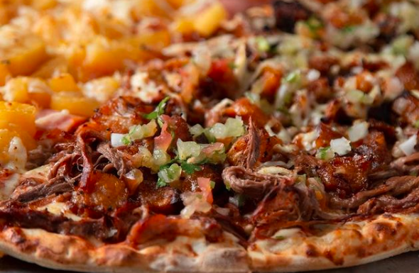 Carne napolitana de res, pollo, tocineta, frijol refrito, salsas de la casa y ensalada de la casa