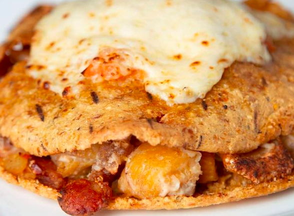 Queso, carne napolitana, tomate, cebolla, maíz tierno, chorizo y aguacate