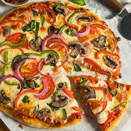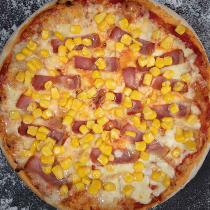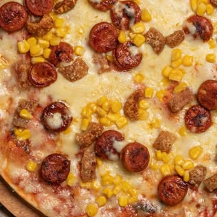 DOBLE QUESO, TOMATE, MAIZ TIERNO, CHAMPIÑONES, PIMIENTO Y CEBOLLA