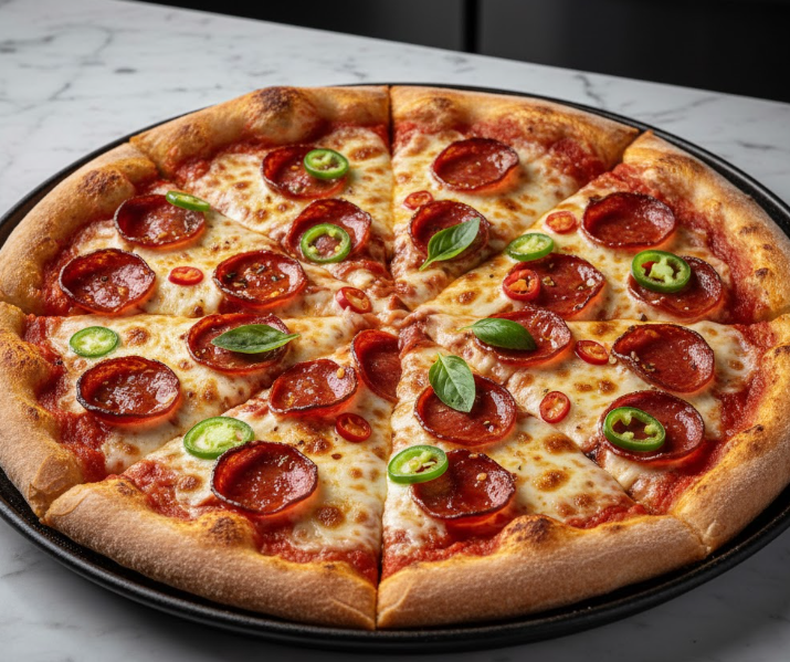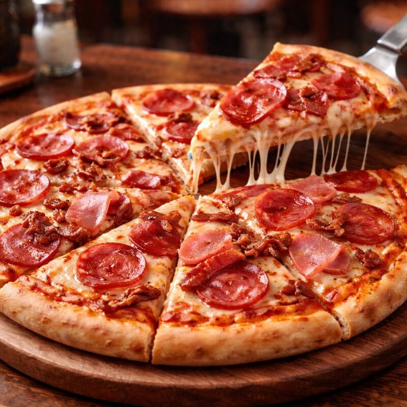 pomodoro, mozarella, jamon, tocineta, pepperoni y salami