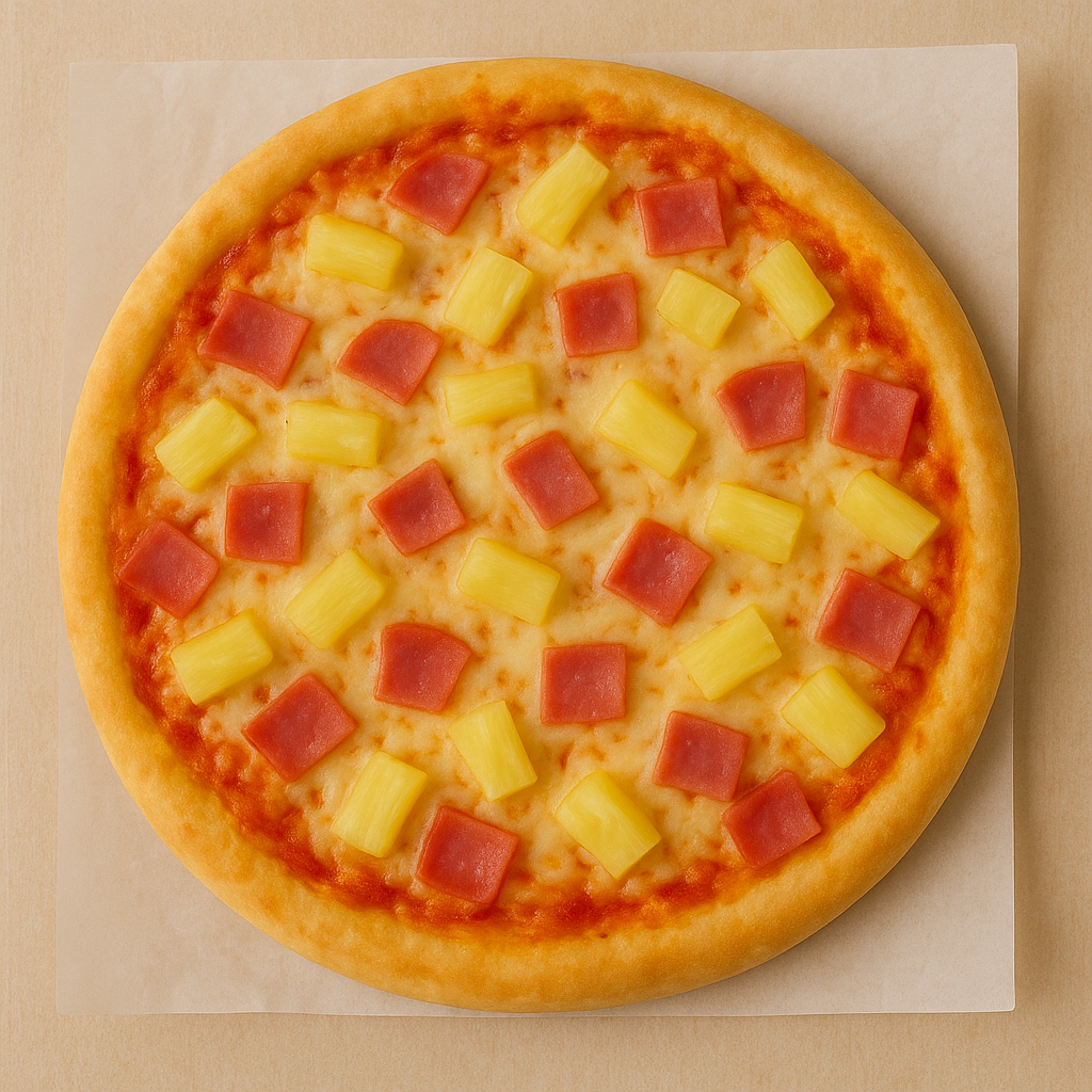 Pizza de 8 porciones con salsa napolitana, queso mozzarella, jamón y piña caramelizada.