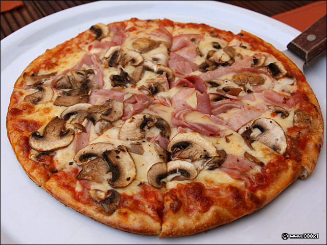 Pizza de 8 porciones con salsa napolitana, queso mozzarella, jamón, pepperoni, pimentón y champiñones.