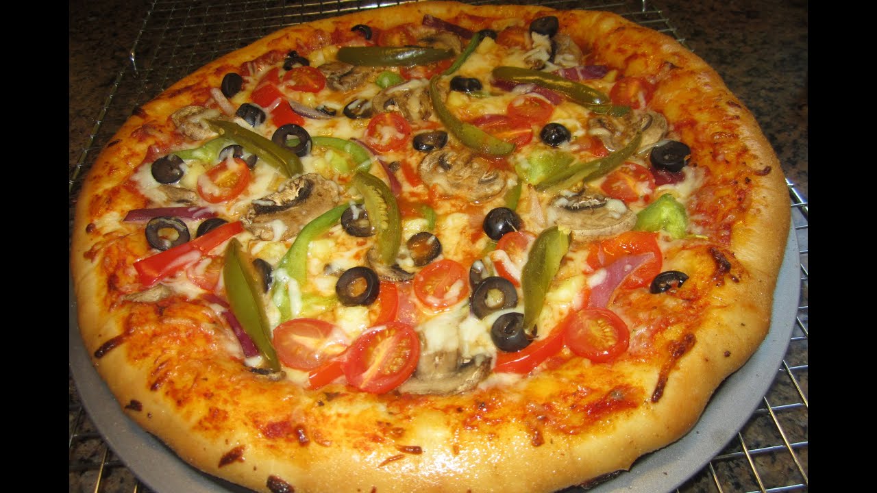 Pizza de 12 porciones con salsa napolitana, queso mozzarella, cebolla, pimentón, aceitunas y champiñones.