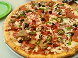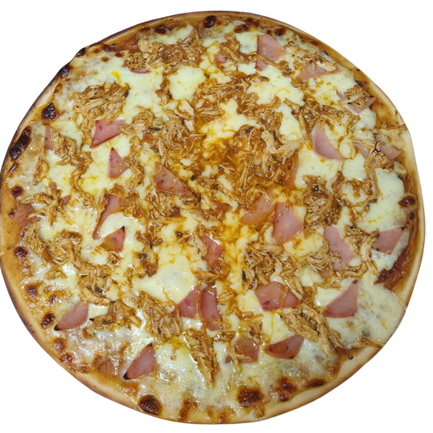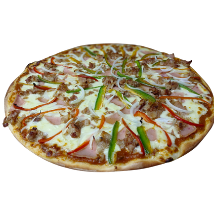 Pizza de 6 porciones con jamón, salami, pepperoni, pollo, y tocineta.