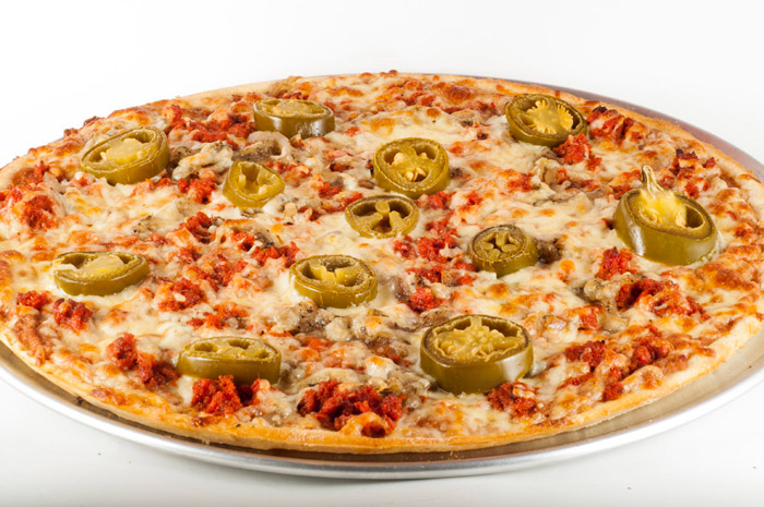 Pizza de 12 porciones con salsa napolitana, queso mozzarella, carne, maicitos, cebolla, tomate y jalapeño.