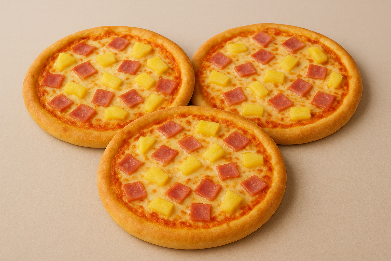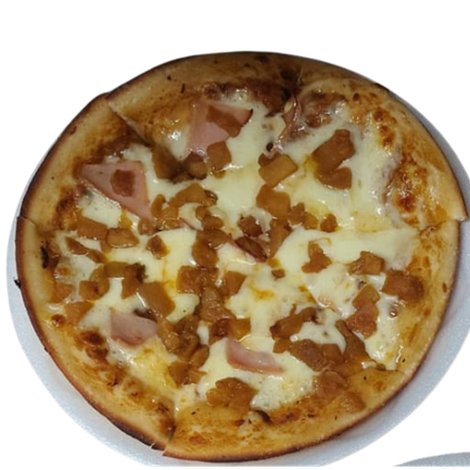Pizza de 6 porciones con salsa napolitana, queso mozzarella, jamón y piña caramelizada