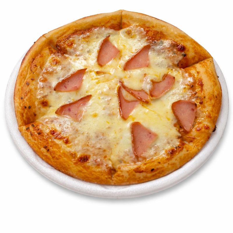 Pizza de 6 porciones de jamón y queso. Masa gruesa tipo americana.