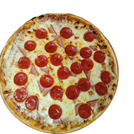 Pizza de 6 porciones con salsa napolitana, queso mozzarella, jamón, salami y pepperoni.