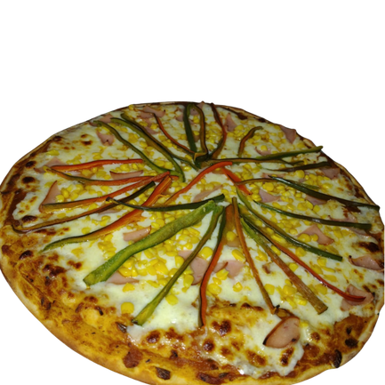 Pizza de 6 porciones con salsa napolitana, salchicha, chicharrón y maíz.