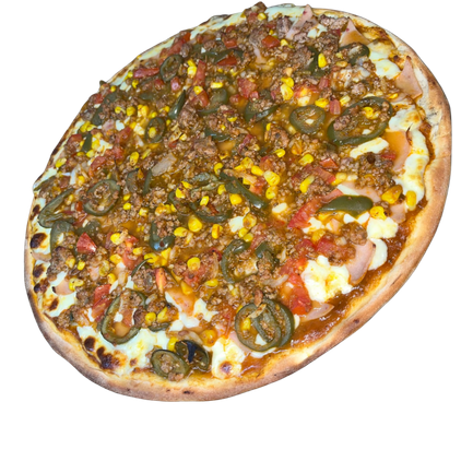 Pizza de 8 porciones con salsa napolitana, queso mozzarella, carne, maicitos, cebolla, tomate y jalapeño.
