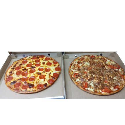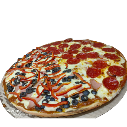 Pizza de 12 porciones con salsa napolitana, queso mozzarella, jamón, salami y pepperoni.