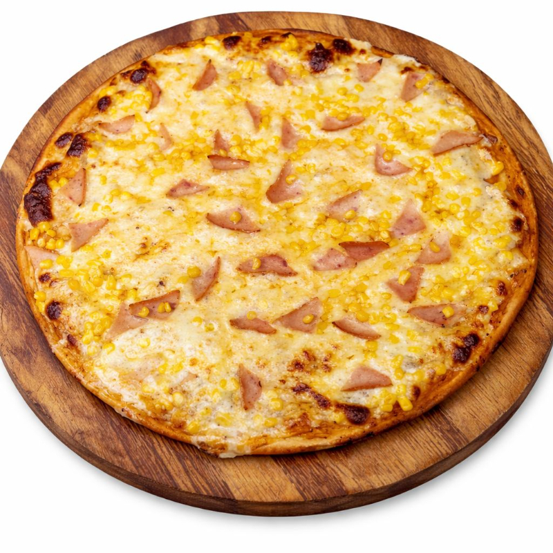 Pizza de 12 porciones con salsa napolitana, queso mozzarella, maíz y tocineta.