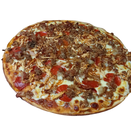 Pizza de 12 porciones con salsa napolitana, jamón, salami, pepperoni, pollo, y tocineta.