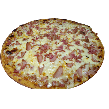 Pizza de 12 porciones con queso mozzarella, jamón y tocineta.