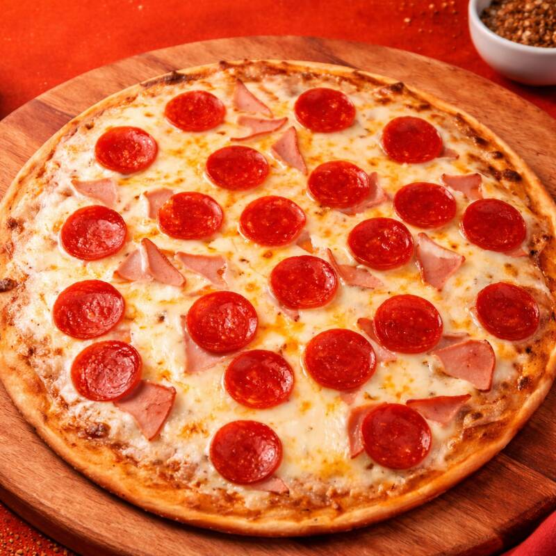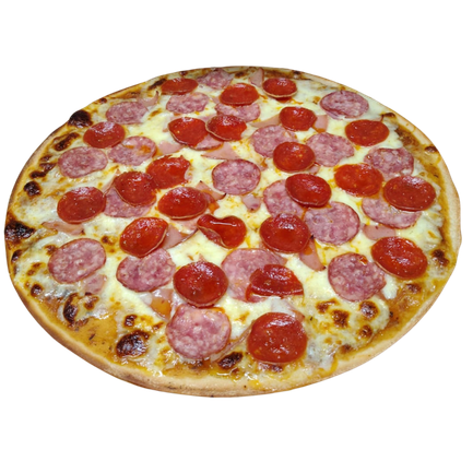Pizza de 8 porciones con salsa napolitana, queso mozzarella, jamón, salami y pepperoni.