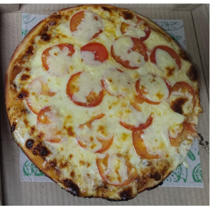 Pizza de 12 porciones con salsa napolitana, queso mozzarella, tomate en rodajas y albahaca.