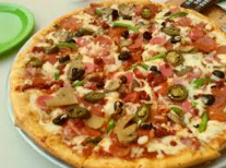 Pizza de 12 porciones con salsa napolitana, queso mozzarella, jamón, pepperoni, pimentón y champiñones.