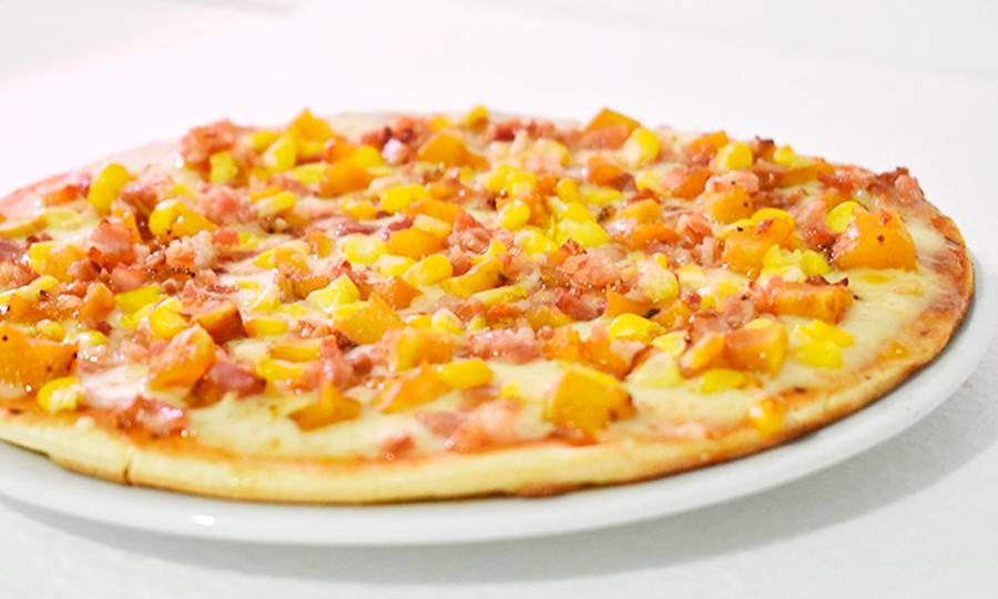 Salsa napolitana, queso mozzarella, maicitos y tocineta.