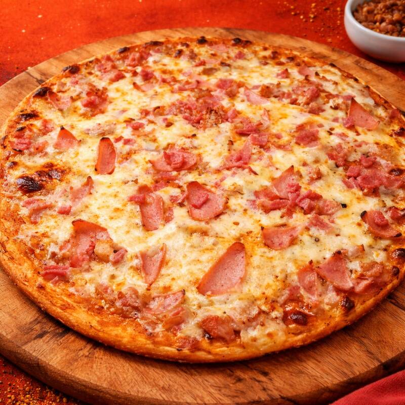 Pizza de 12 porciones con queso mozzarella, jamón y tocineta.