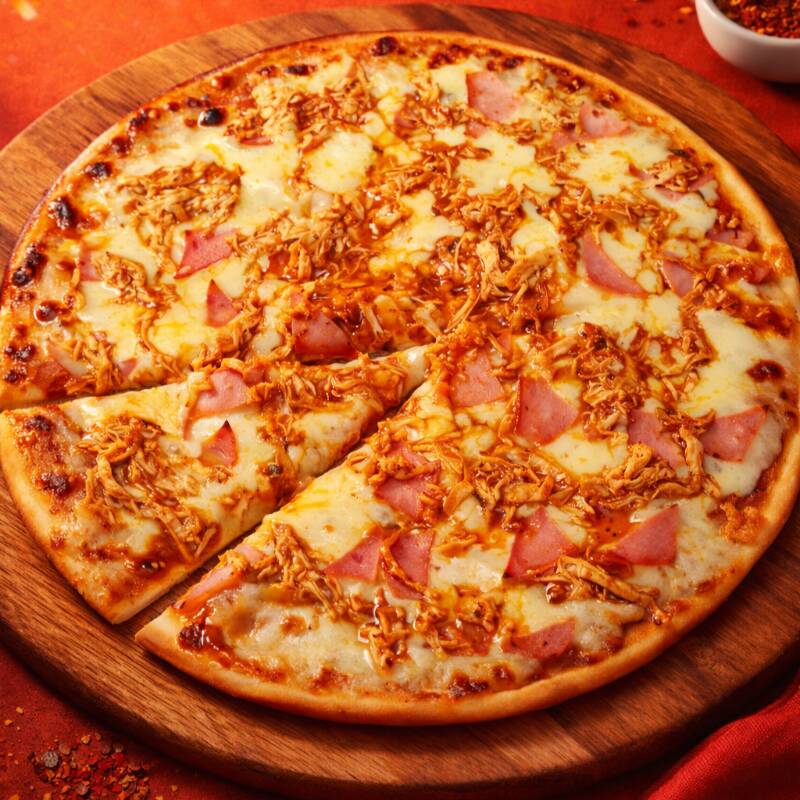 Pizza de 8 porciones con salsa napolitana, queso mozzarella, pollo y champiñones.
