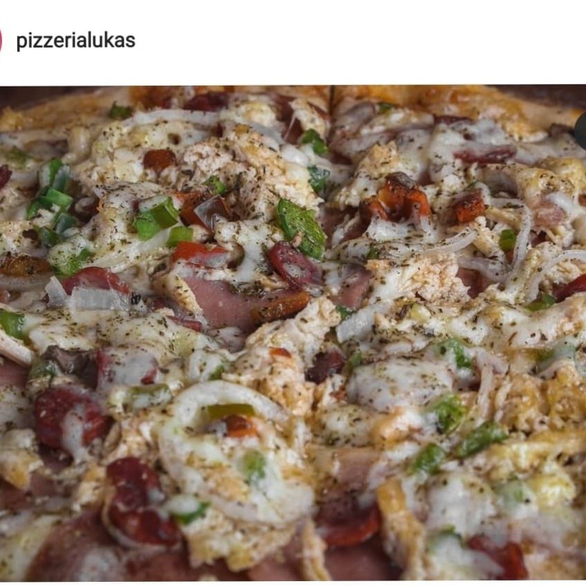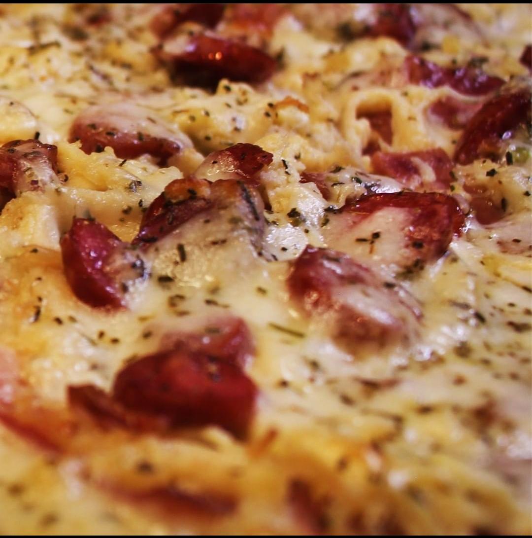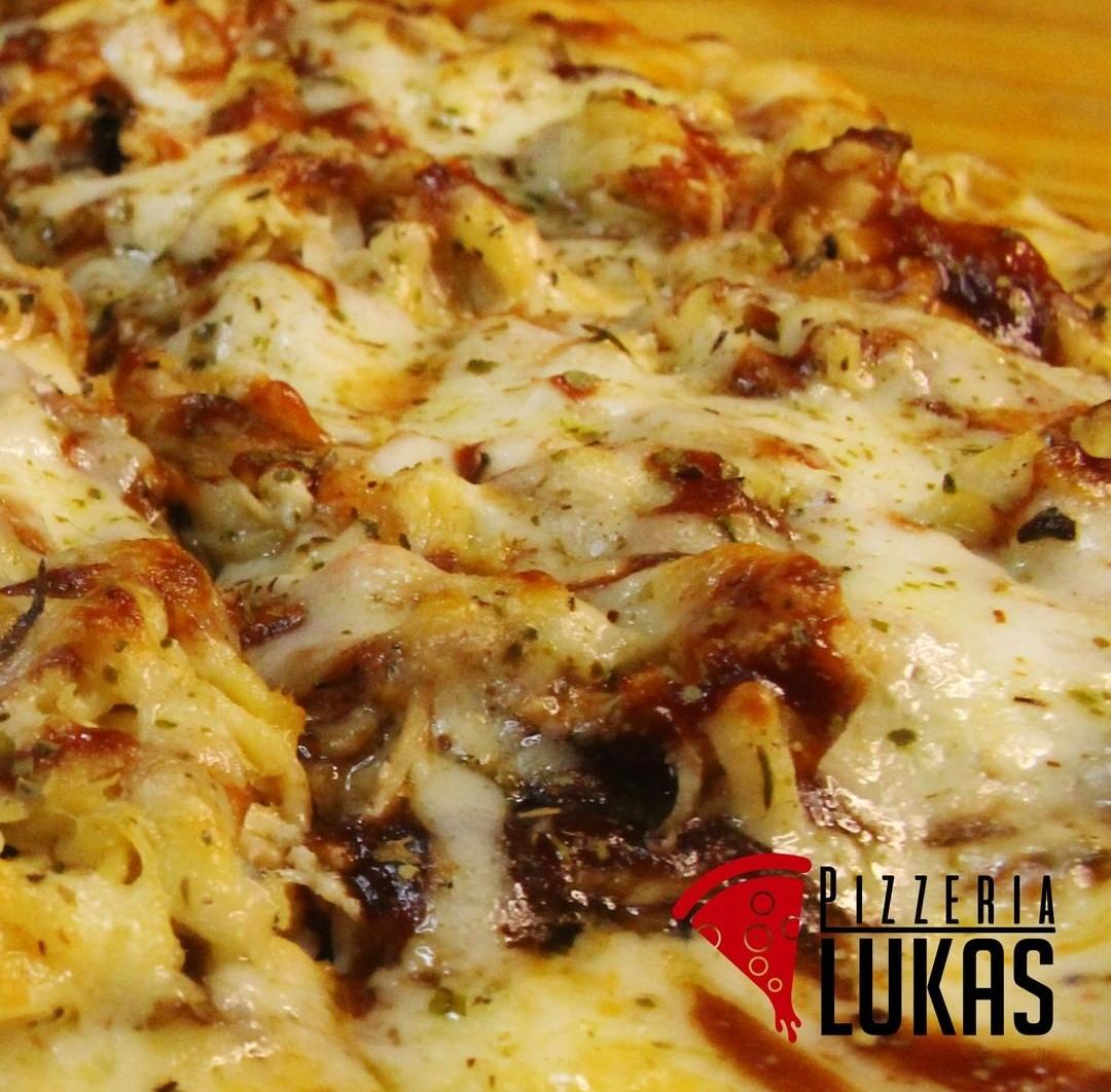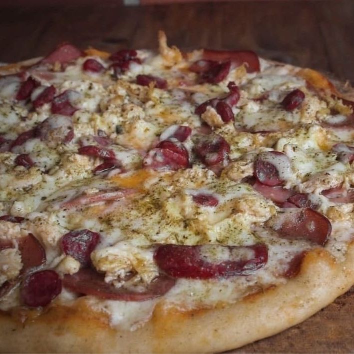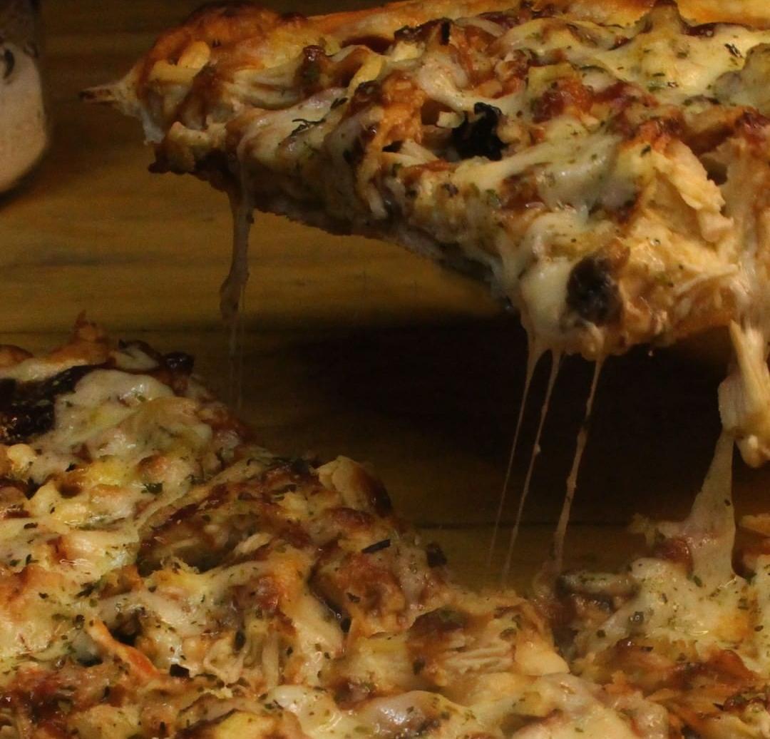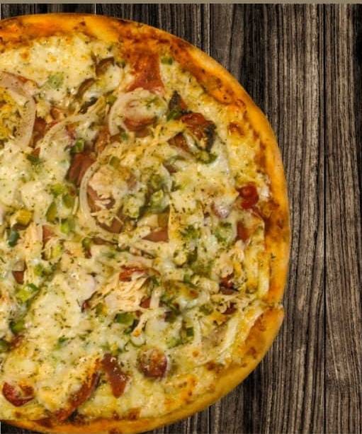 Champiñones, jamón, salami, cabano, pollo, cebolla y pimentón.