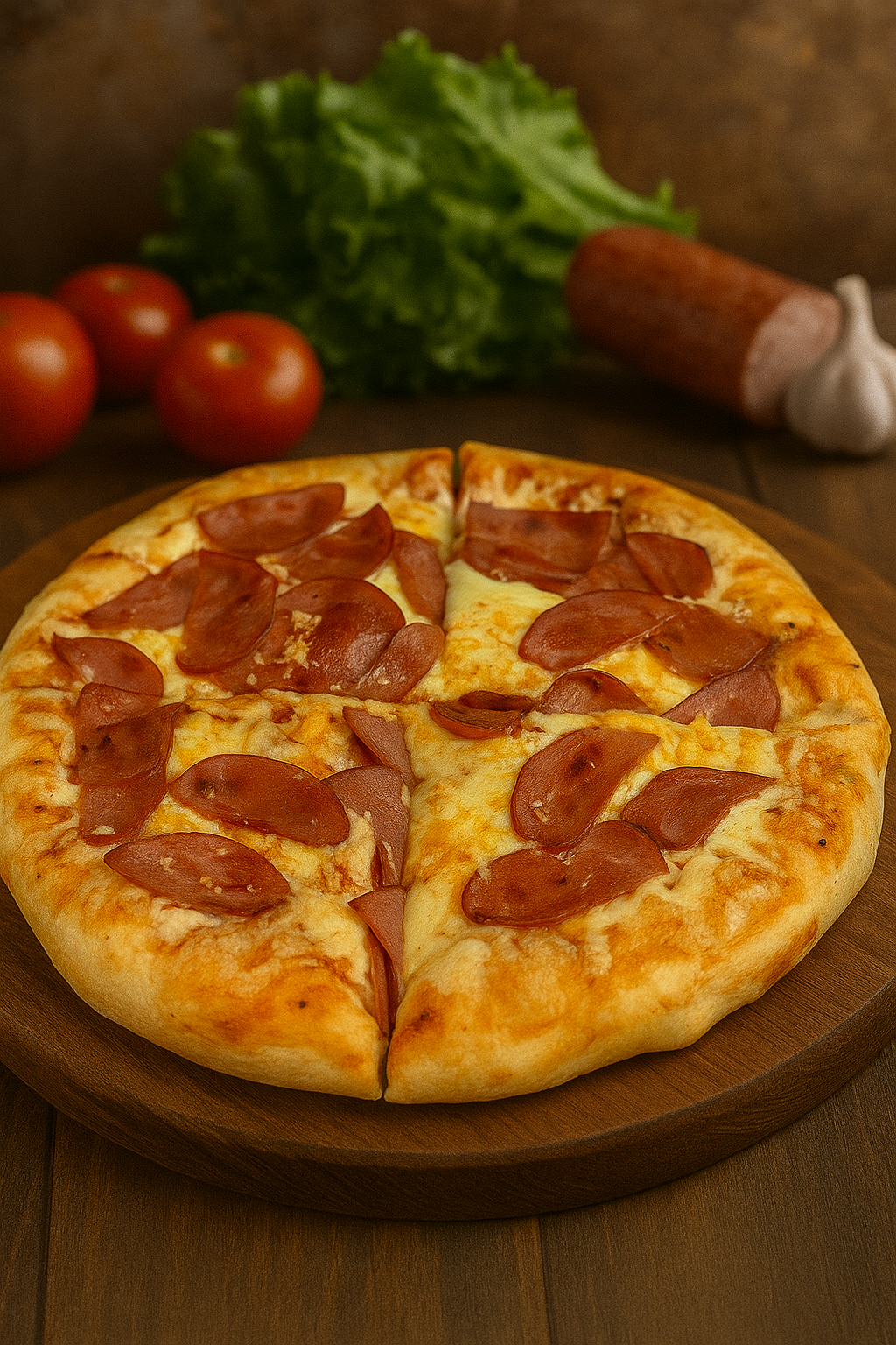 Pizza de 4 porciones (27cm) deliciosa masa elaborado con harina de trigo, sal, y agua horneada, cubierto con salsa acompañada de tus ingredientes favoritos.