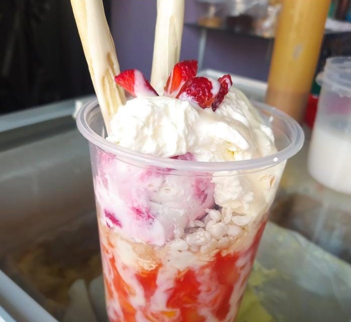 1 Litro de salpicón Con, 2 sabores de Helado, chantillí, queso, arroz soplado y fresa.