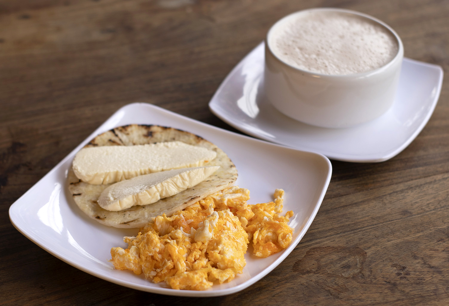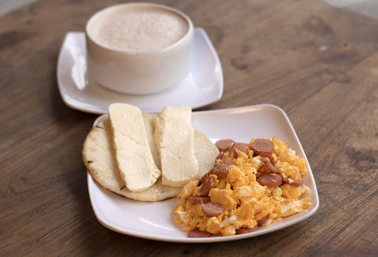 Huevos revueltos, carne, arepa, quesito y bebida