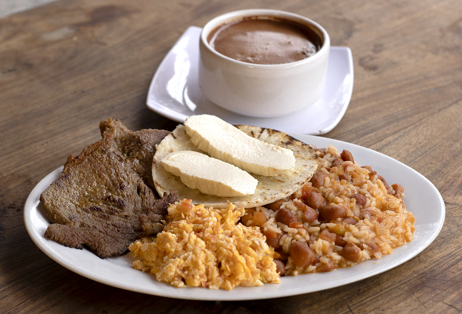 Huevo revuelto, calentado, carne, arepa, quesito y bebida de 12 onzas.