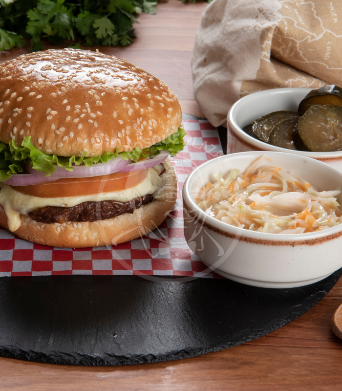 Hamburguesa sencilla (pan, 1 carne, 1 mozzarella, lechuga crespa y tomate).