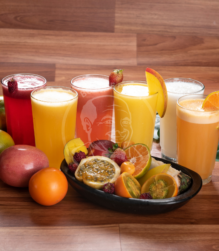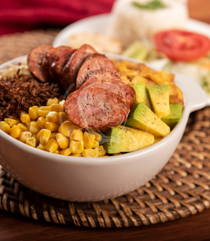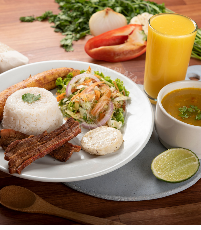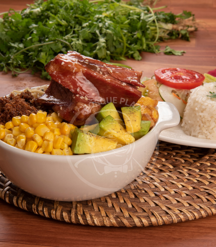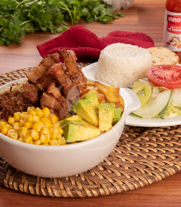 Acompañado con frijol, chip maduro, maíz tierno, aguacate, carne molida, ripio de papa. Seco: arroz, arepa y ensalada verde de la casa.