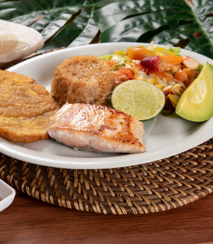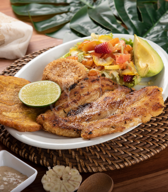 Trucha apanada o a la plancha, acompañada de arroz con coco o arroz blanco, patacón, aguacate y ensalada verde de la casa.