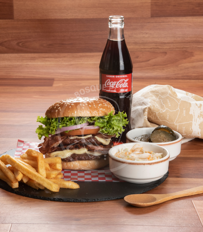 Pan, 2 carnes, 2 mozzarella, 2 porciones de tocineta, lechuga crespa, tomate, papas y gaseosa Coca-Cola de 350 ml.