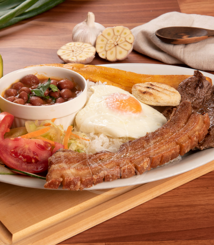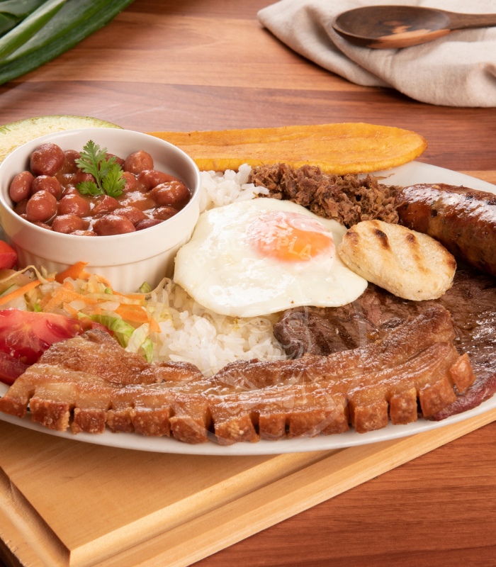 Frijoles, arroz, ensalada, arepa, maduro, carne, chorizo, carne molida, chicharrón, morcilla, aguacate y huevo.