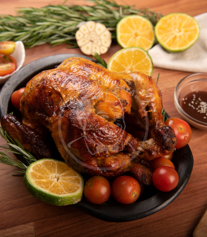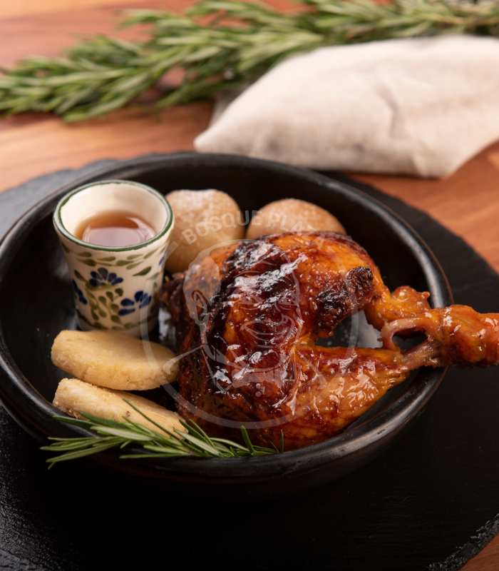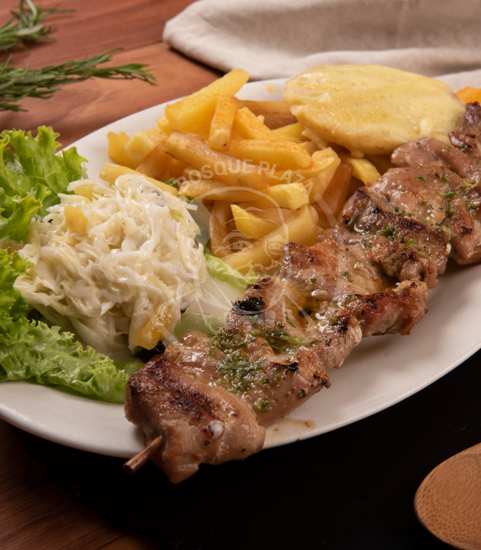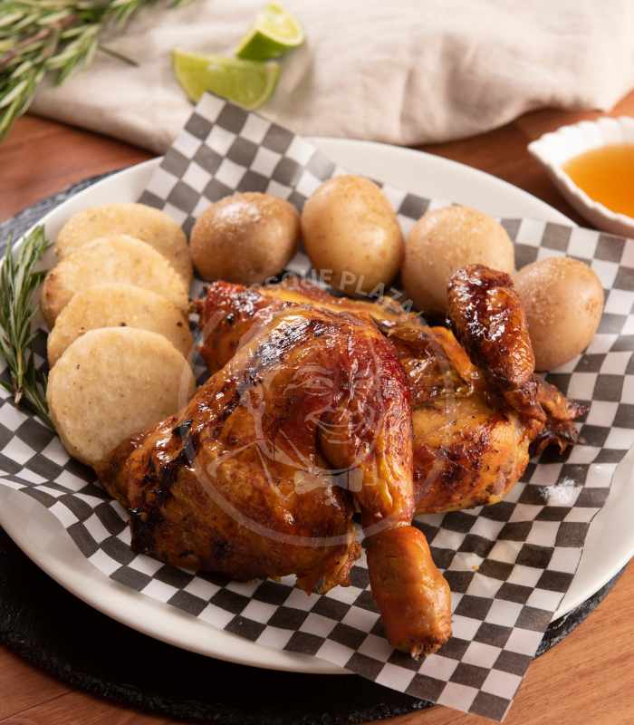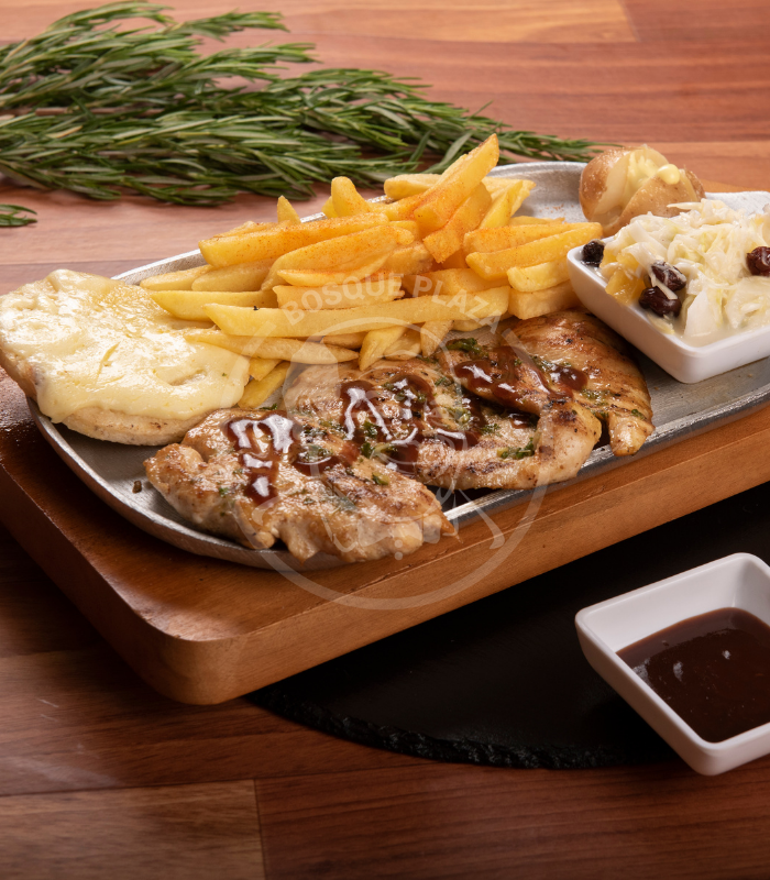 300 g de pechuga de pollo, acompañado de papa al vapor o papa francesa, arepa, queso mozzarella y ensalada dulce.